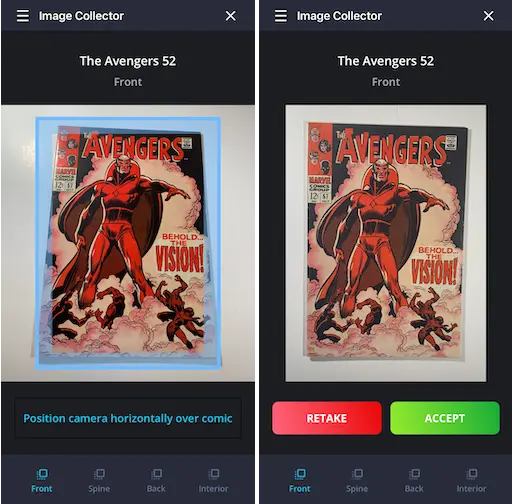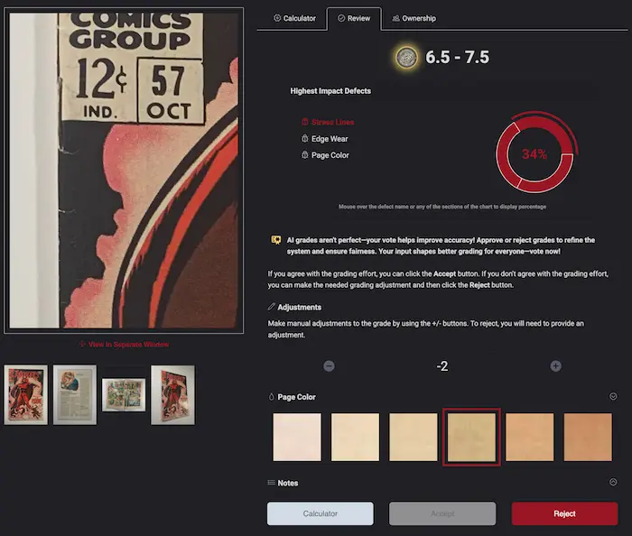 Receive AI Grade (Comic Oracle™): Receive an AI-generated grade and defect summary soon after uploading via the Image Collector App, providing an initial estimate of your comic’s condition.