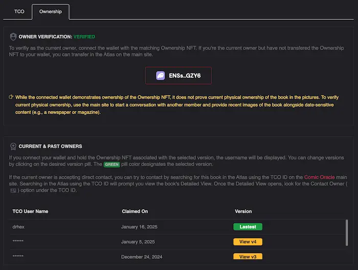 Ownership Record Transfer: After an agreed upon exchange, viewers can request to transfer the comic’s digital ownership record from the Detail View. When the transfer completes, the new owner then receives 10 days of free storage to choose a storage plan. The digital record is only updated once the new owner proves they have the physical comic by uploading fresh images using the Deed Maps Image Collector App. Assuming the new owner chooses the Permaweb storage option, an additional version of the NFT is minted so that the original owner has v1 and the new owner v2.