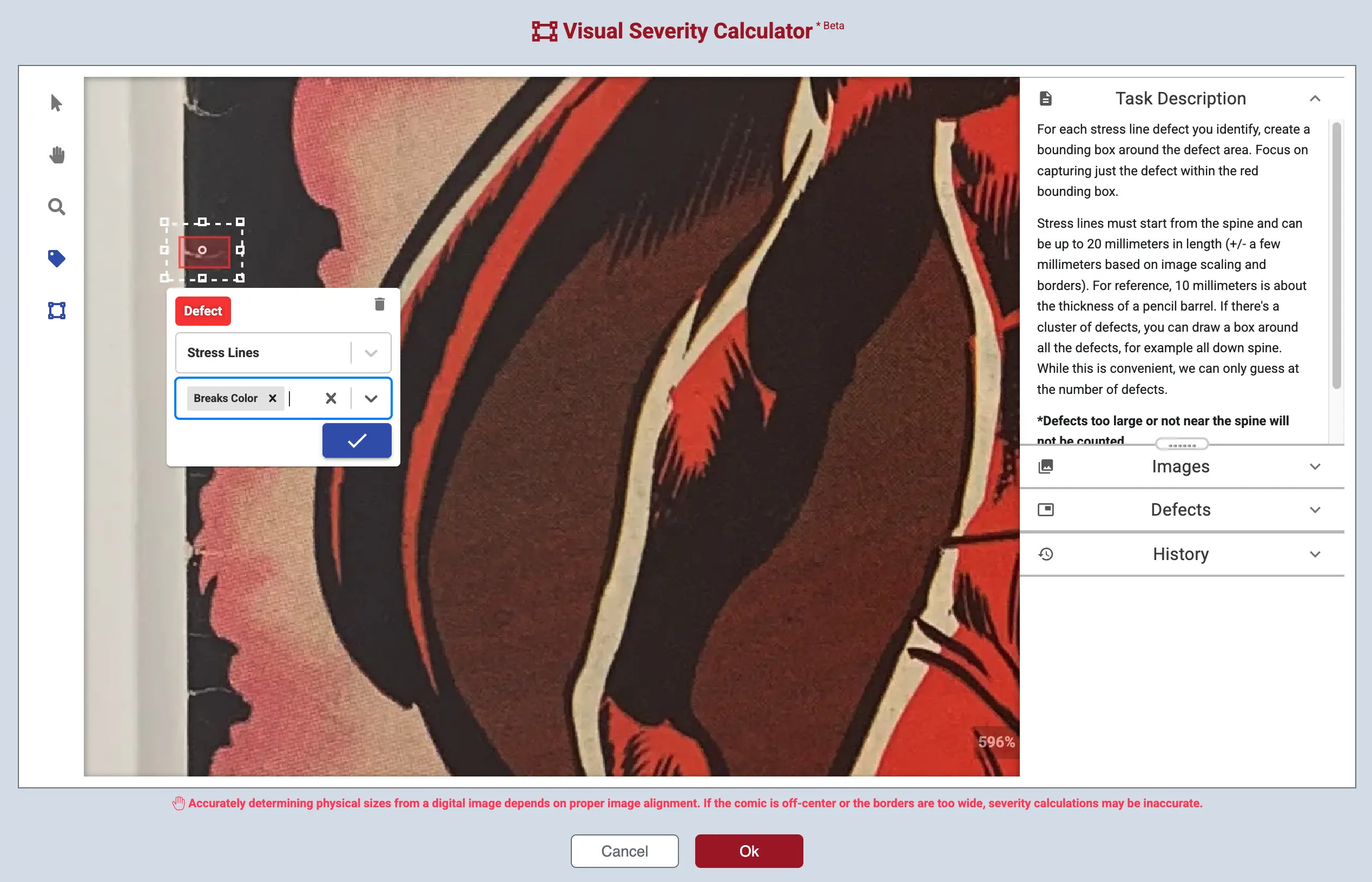 Currently available for spine stress lines only, we’re previewing a new tool on the Detail View's Calculator tab that helps you visually determine a defect's severity. Using simple drawing tools and defect attributes such as Color Breaking, you will have the ability to visually annotate the location of defects. Once the defects are annotated, the correct severity level will be set. Based on feedback from collectors, we’ll decide if and how to expand it to cover more defects.